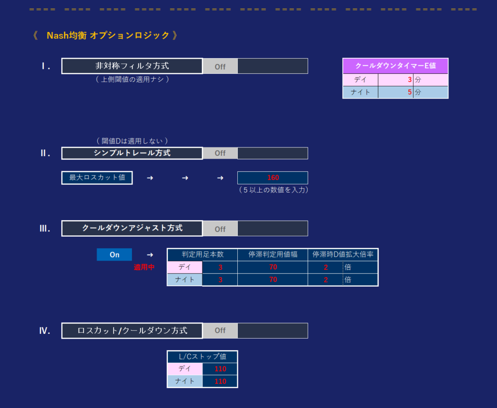 《Nash均衡オプションロジック》と書いてある下の部分の大項目で表示されている部分が新しく追加された新機能の数々です。