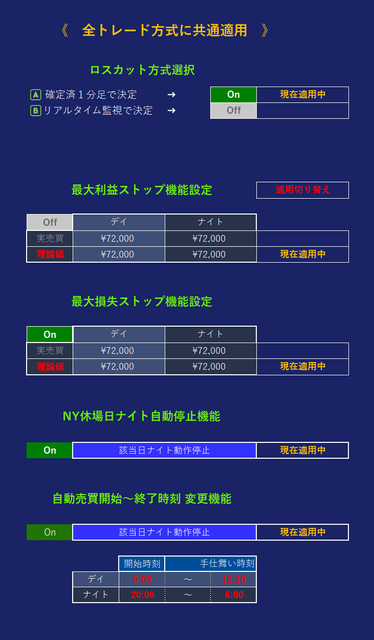 ONにして、デイセッション、ナイトセッションで、その日の自動売買開始時間、自動売買終了時間、各々変更できます。